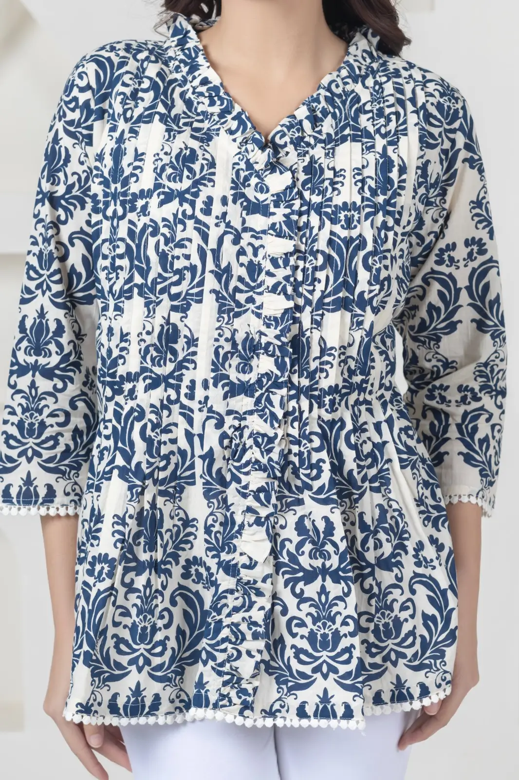White Blue Print Top